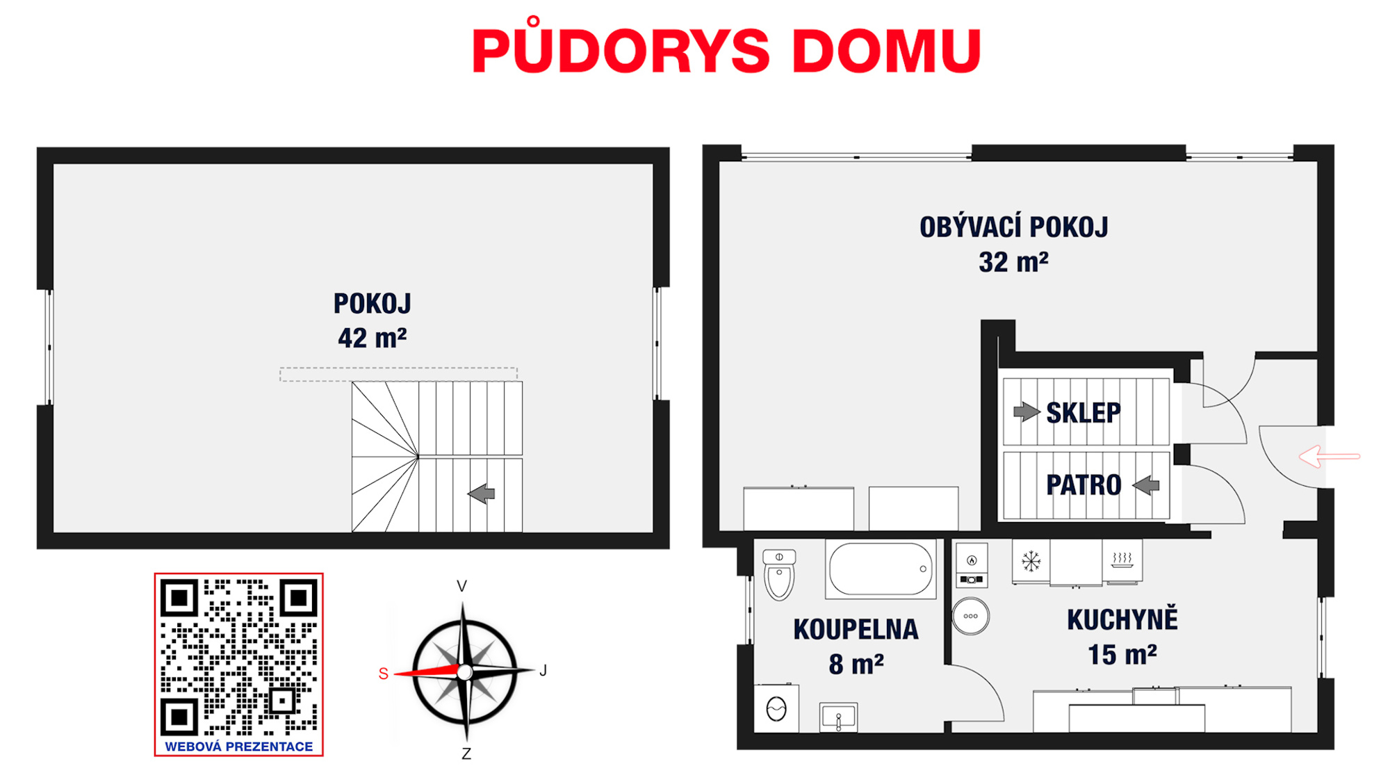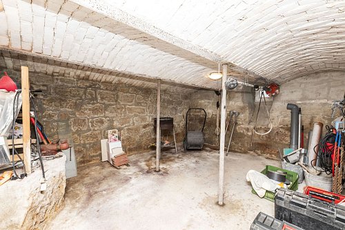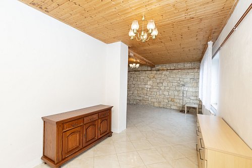 Dispozice domu zahrnuje prostornou kuchyni o velikosti 15 m², která poskytuje dostatek místa jak pro vaření, tak pro společné stolování. Koupelna o výměře 8 m² je vybavena tak, aby odpovídala současným standardům. Dominantou přízemí je velký obývací pokoj o ploše 32 m², ve kterém zaujme kamenná stěna dodávající prostoru osobitý charakter.
