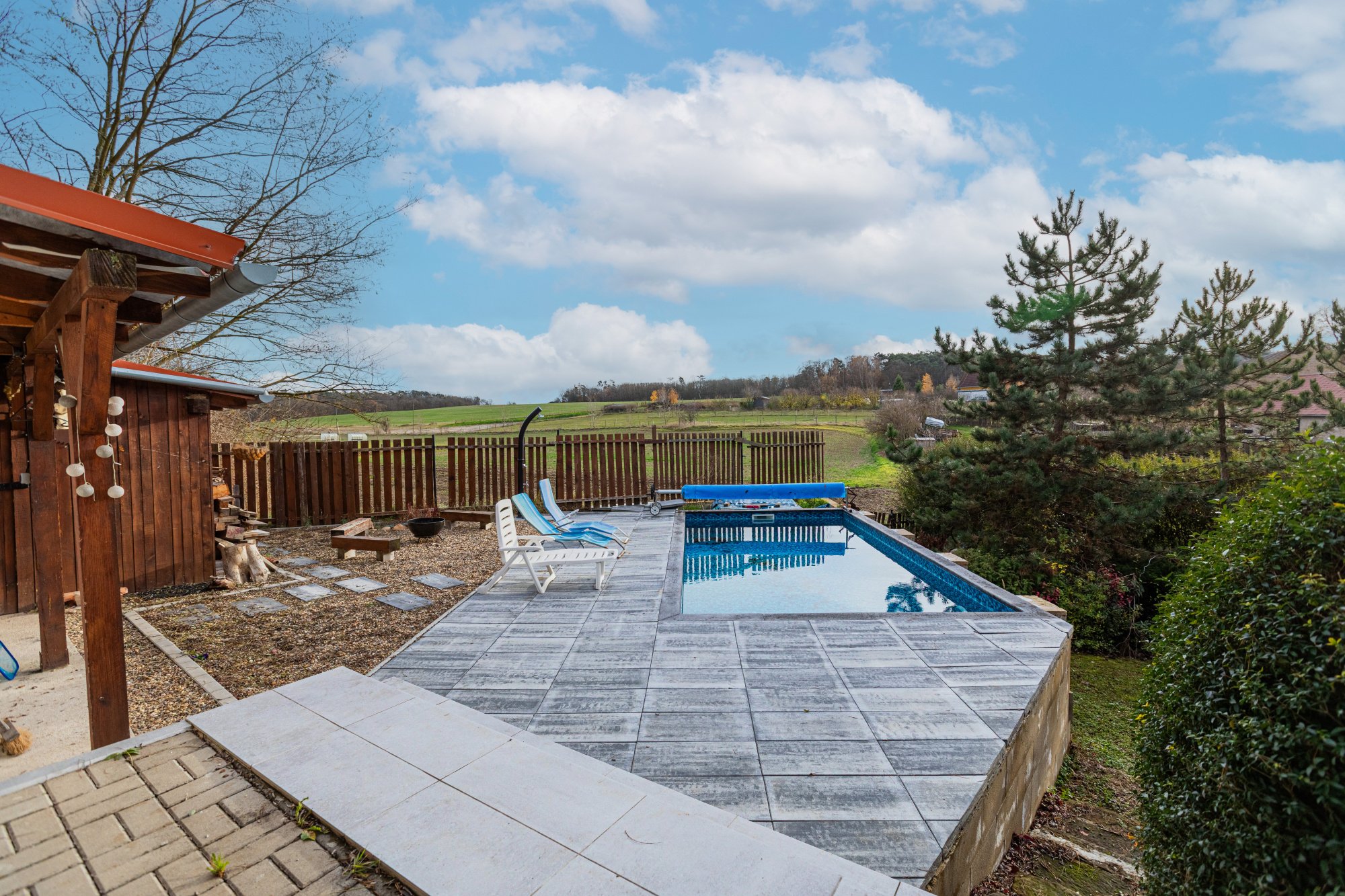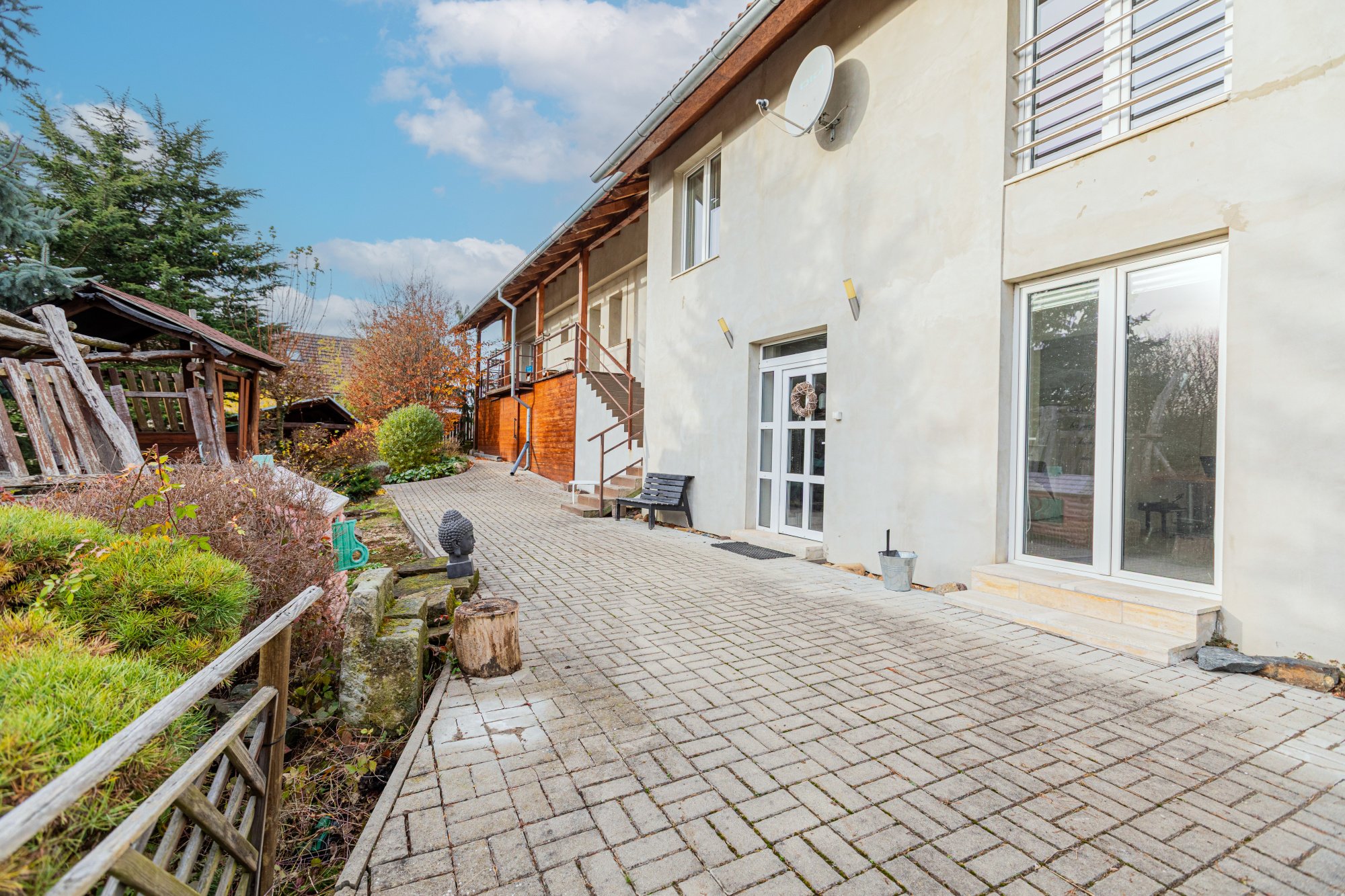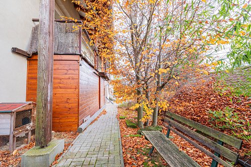 Na dům plynule navazuje venkovní terasa s kuchyní a samostatným WC – praktické zázemí pro setkávání s rodinou a přáteli. Bezprostředně u terasy je bazén 3,3 x 6,5 metru se slanou vodou a terasovým ochozem, dále venkovní ohniště a sauna pro 6 osob. K dispozici je také dílna. Okrasná zahrada s jezírkem vytváří klidné mikroklima a příjemné soukromí. Ve spodní části pozemku je vjezd a kryté stání pro auta. Přístup do domu je bezbariérový přímo z ulice.