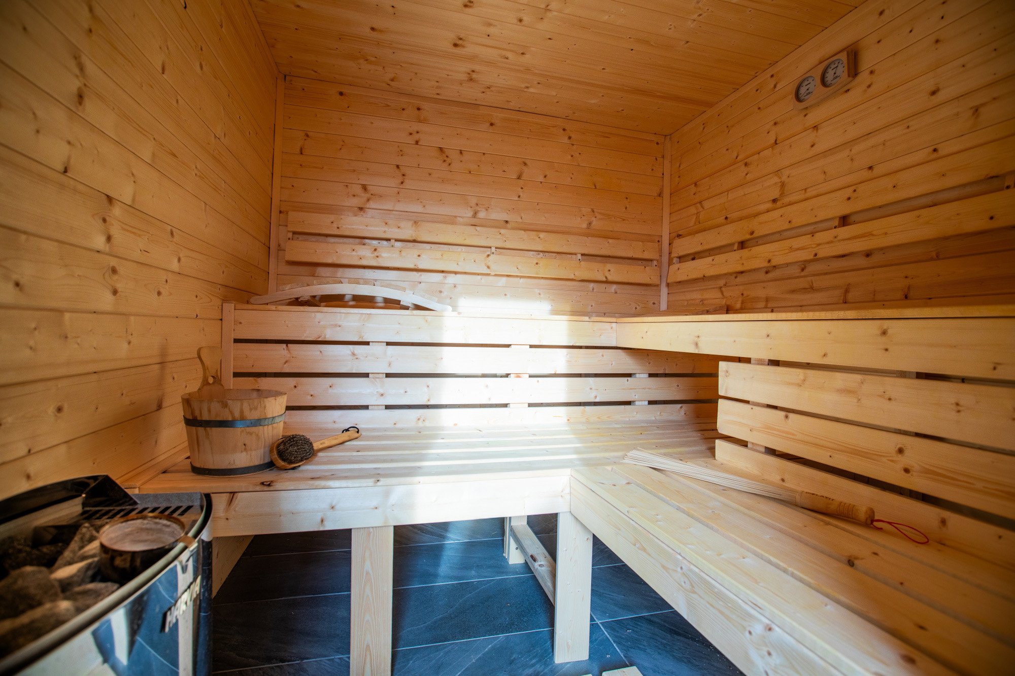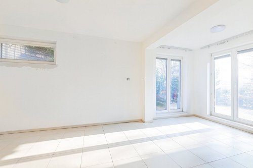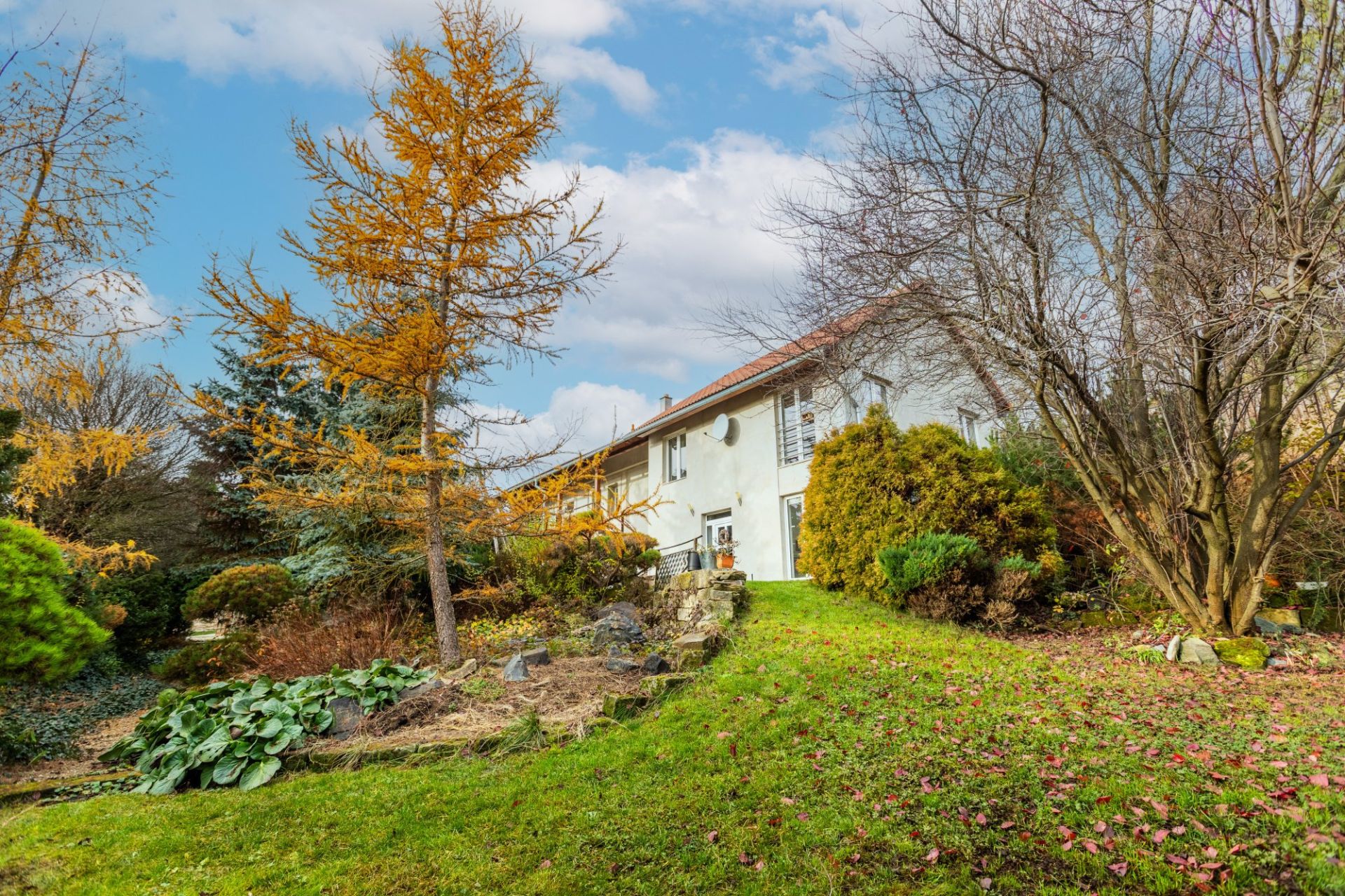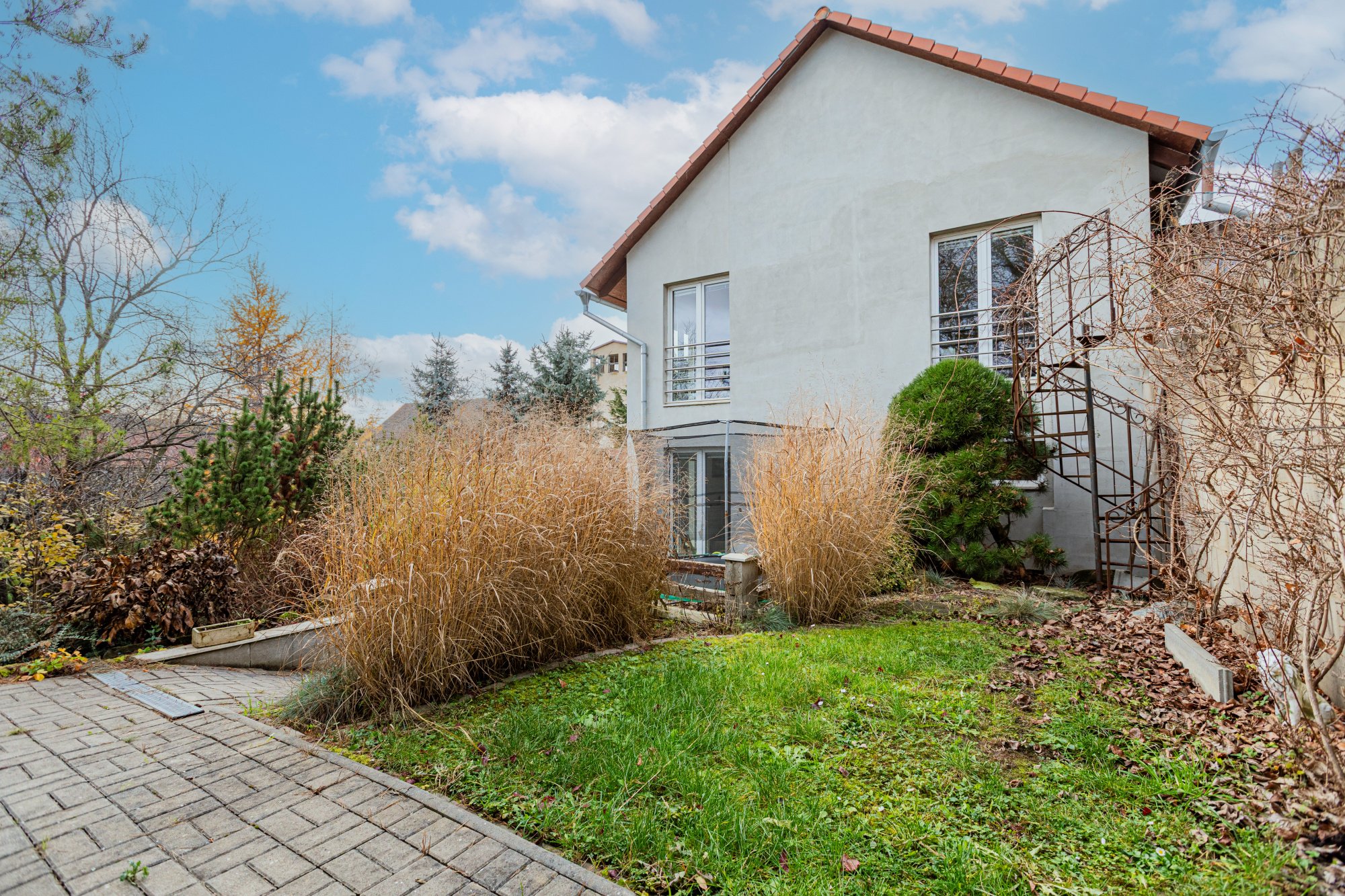 Na dům plynule navazuje venkovní terasa s kuchyní a samostatným WC – praktické zázemí pro setkávání s rodinou a přáteli. Bezprostředně u terasy je bazén 3,3 x 6,5 metru se slanou vodou a terasovým ochozem, dále venkovní ohniště a sauna pro 6 osob. K dispozici je také dílna. Okrasná zahrada s jezírkem vytváří klidné mikroklima a příjemné soukromí. Ve spodní části pozemku je vjezd a kryté stání pro auta. Přístup do domu je bezbariérový přímo z ulice.