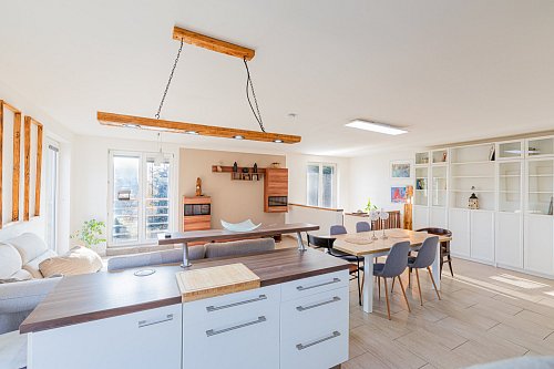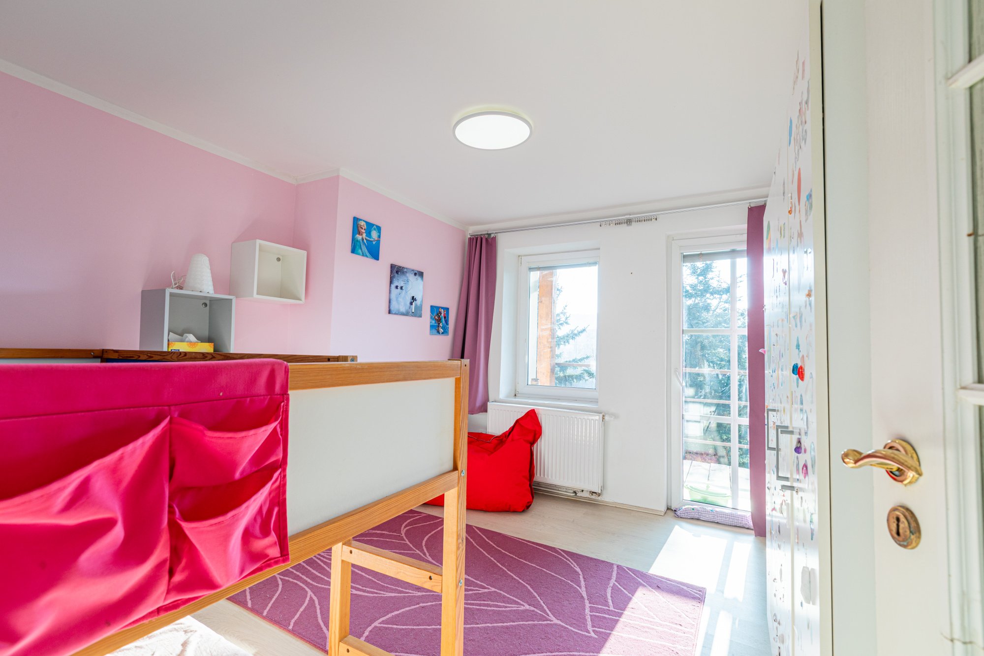 Dispozice je promyšlená pro rodinu: prostorný obývací pokoj s kuchyní (49 m²), pokoj pro chlapce (12,5 m²), dívčí pokoj (11 m²) a ložnice rodičů (22 m²) se samostatnou šatnou (3 m²). Všechny obytné místnosti jsou orientovány na jih, což zajišťuje dostatek světla během dne. Vytápění i ohřev vody je řešen plynovým kotlem – provozně úsporné a komfortní řešení.