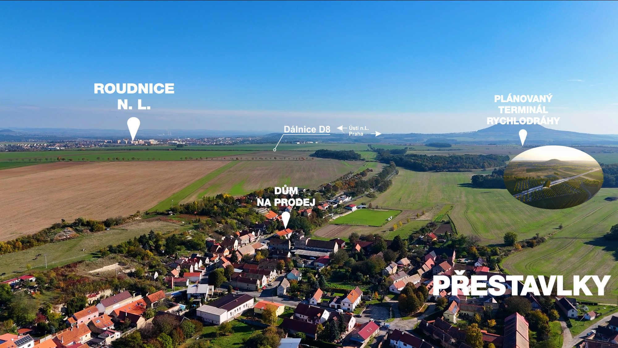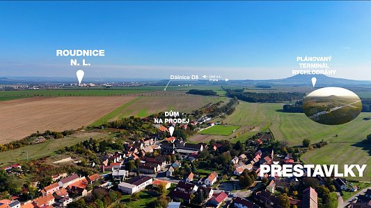 Dům se nachází v obci Přestavlky u Roudnice nad Labem. Poloha potěší každodenní dojíždění i víkendové výlety: do Roudnice nad Labem přibližně 4 minuty, po dálnici D8 do Prahy cca 22 minut, k plánovanému terminálu vysokorychlostní tratě (VRT) zhruba 4 minuty. V obci je mateřská školka, potraviny, hospůdka, dětské a fotbalové hřiště. Okolní lesy a polní cesty vybízejí k procházkám, běhu i jízdě na kole – příjemné místo pro aktivní venkovní život.