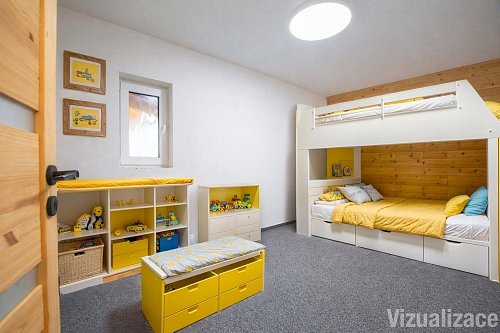 pokoj naproti zádveří o velikosti 11,65 m², vhodný jako dětský pokoj nebo pracovna, odkud vedou schody na půdu