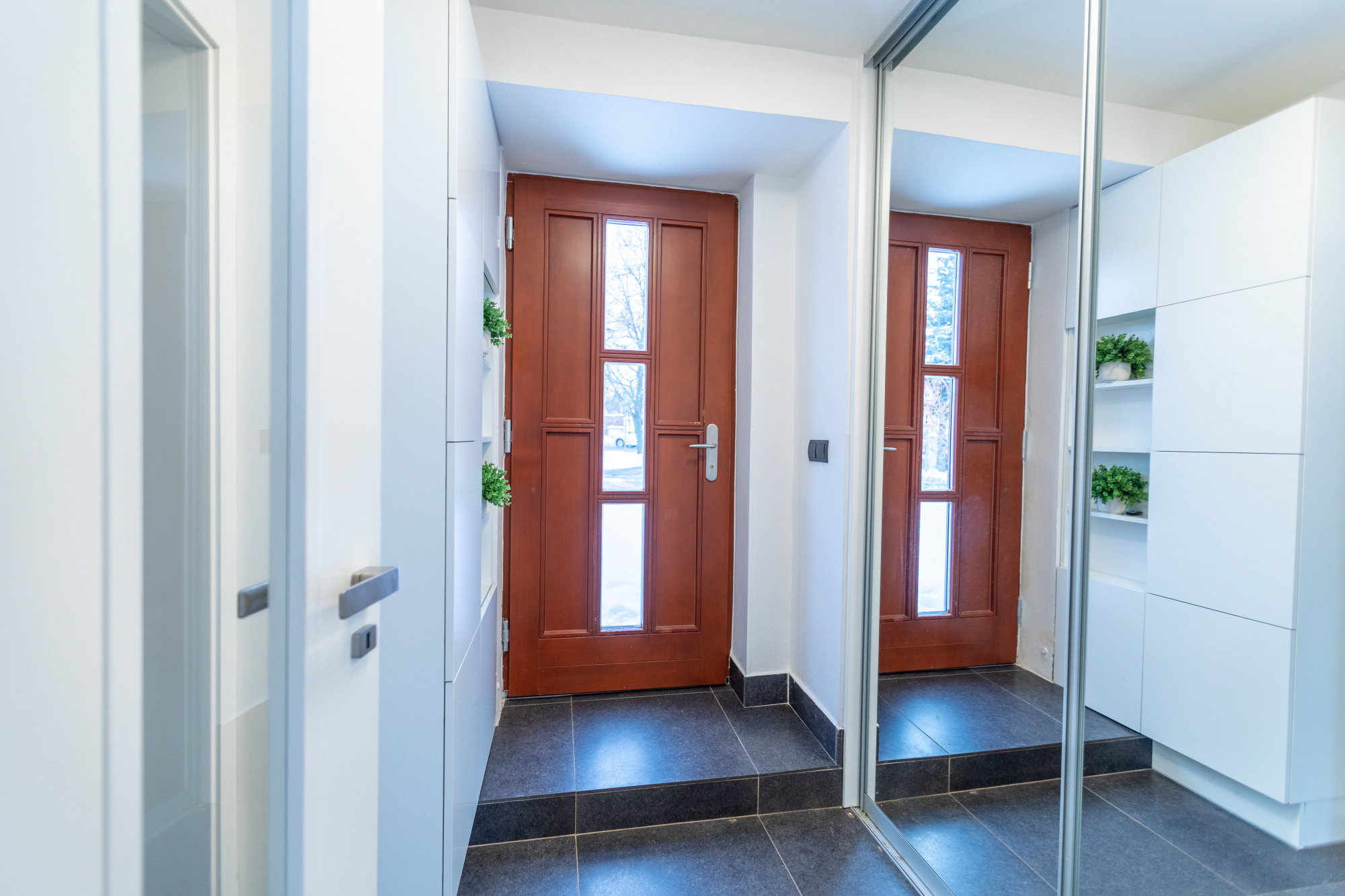 Průchozí garáž umožňuje pohodlný přístup ze vstupní části domu přímo na zahradu, což oceníte při každodenním provozu i při práci venku.