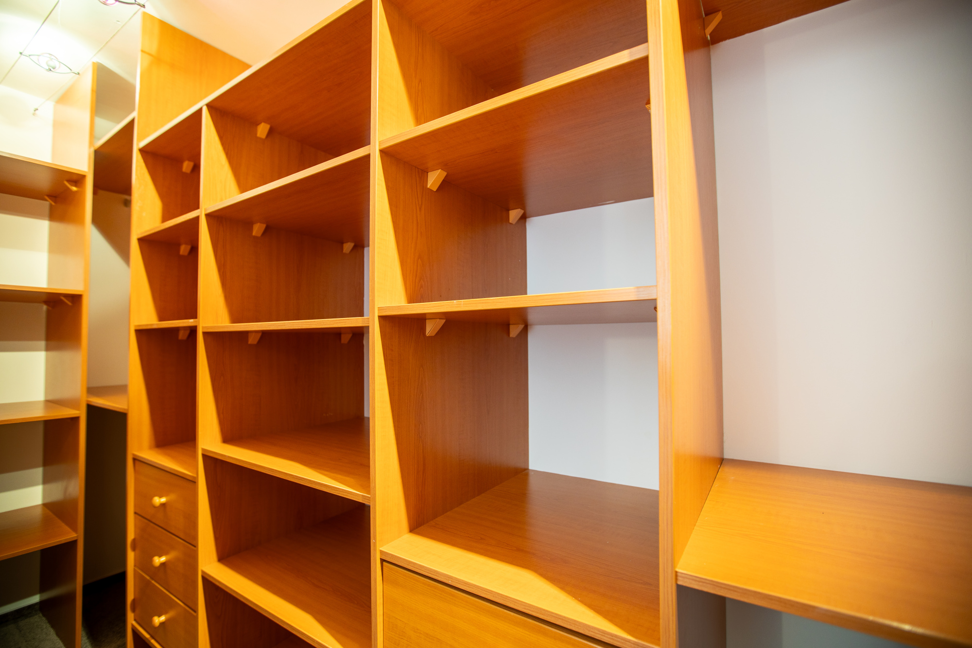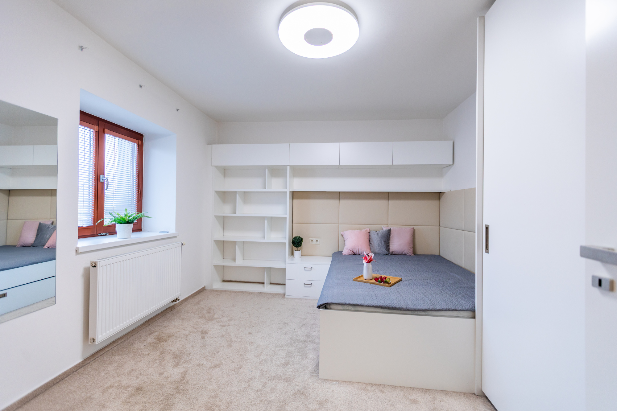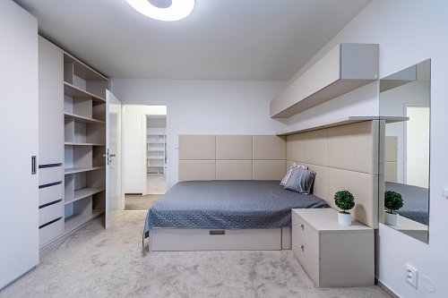 V patře je umístěna ložnice (16,5 m²), dva samostatné pokoje (15,5 m² a 13,5 m²), koupelna (11 m²), samostatné WC, technická místnost (5,5 m²) a druhá šatna (6 m²). Dvě šatny s vestavnými skříněmi zajišťují dostatek úložného prostoru bez nutnosti dalších zásahů do interiéru.