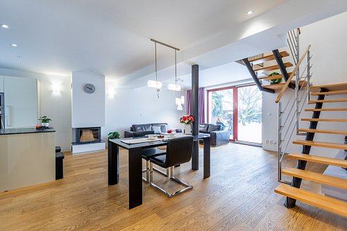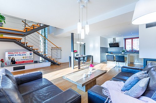 V přízemí vás přivítá otevřený obytný prostor s kuchyňským koutem o velikosti 48 m². Obytná část je prakticky propojena s kuchyní, která je vybavena vestavnými spotřebiči značek Küppersbusch a Siemens. Celek působí vzdušně a zároveň funkčně – vaření, stolování i odpočinek zde přirozeně navazují jeden na druhý.
